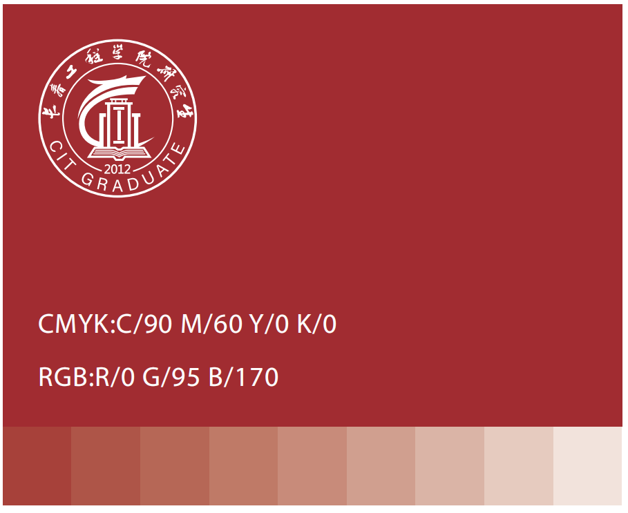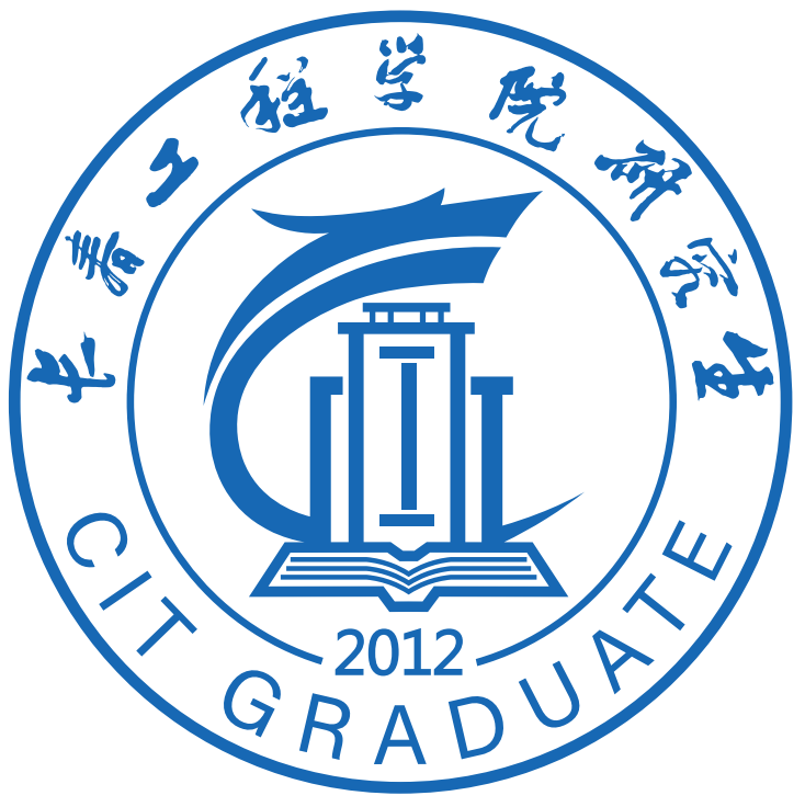 长春工程学院研究生标识以圆形为轮廓,外环篆刻“长春工程学院研究生”与英文“CIT GRADUATE”,内环标注“2012”,铭记研究生教育启航之年;核心图案中,腾飞巨龙和第七教学楼构成象形“CIT”,第七教学楼台阶形似书籍与字母元素融合,寓意长工程研究生以知识为舟,在学术海洋中乘风破浪、勇往直前。